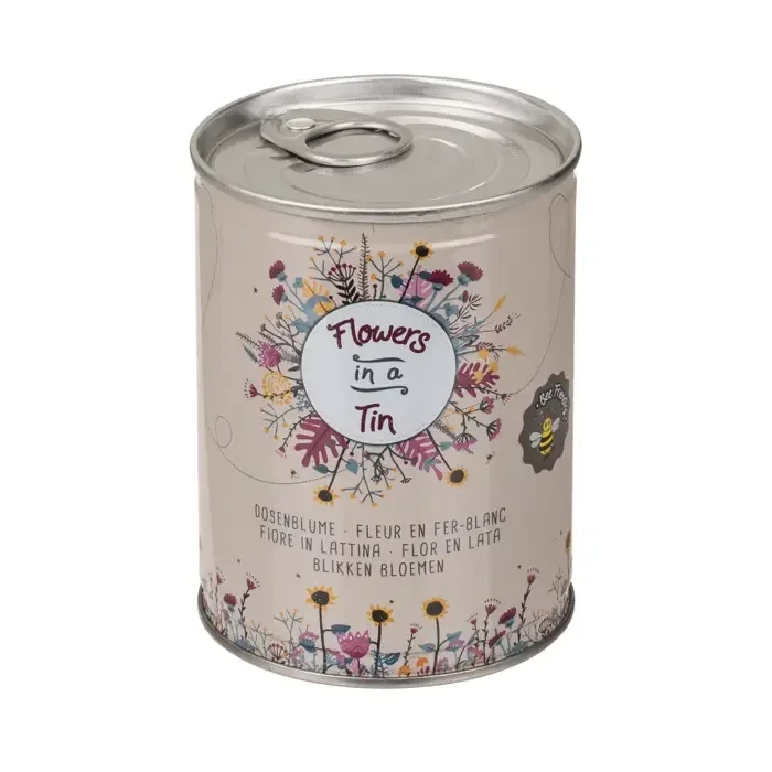 Met onze bloemenweide in blik tovert u eenvoudig een kleurrijke variëteit tevoorschijn en steunt u tegelijkertijd onze belangrijke bijen! Het blik bevat al bijna alles wat u nodig heeft: voedzame grond en bloemenzaden. Wat u verder nodig heeft is water en een beetje geduld. De kleurrijke bloemenweide kan zowel binnen als buiten worden geplant.